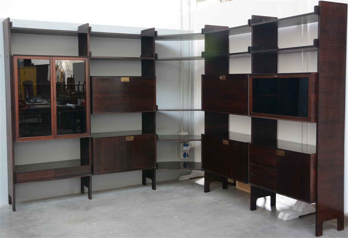 Libreria a quattro campate con cassetti, ripiani a giorno, stipi a ribalta e ad anta e vetrinetta. Rripiani angolari di raccordo con lato interno arrotondato. Italia, anni '60. Legno di palissandro indiamo massello e impiallacciato, ottone e vetro fumè. (cm 245x193x245) (difetti)