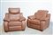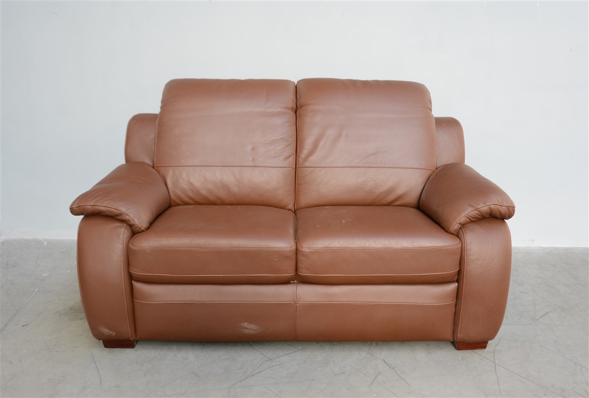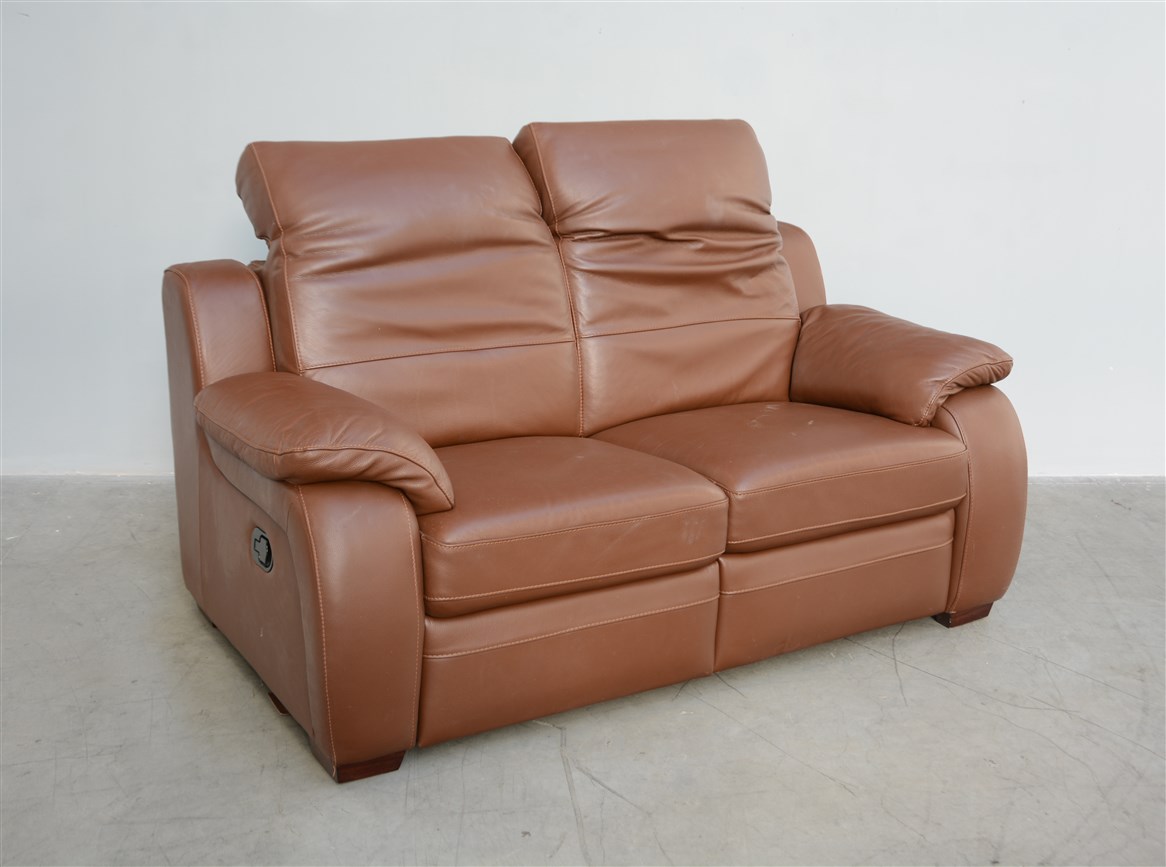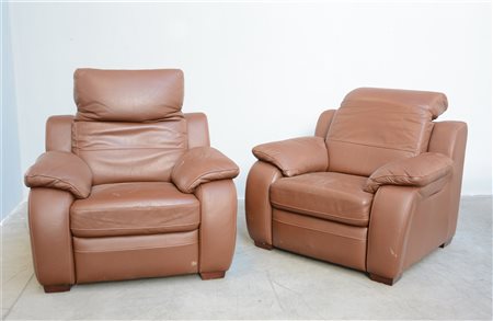 Fornitura da salotto composta da due divani a due posti e due poltrone imbottite e rivestite in pelle marrone parzialmente reclinabili. Italia, 2009. (divani: cm 160x100x90; poltrone: cm 90x100x90) (lievi difetti)