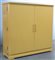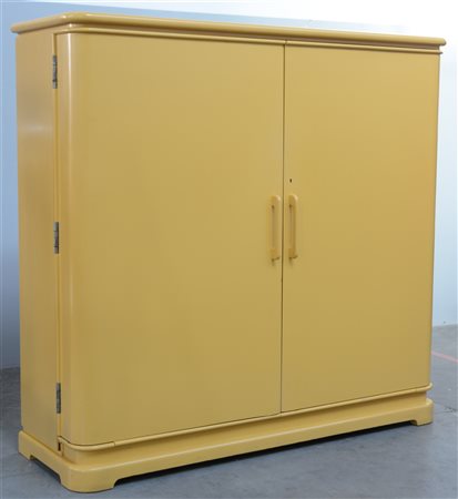 Armadio da uomo a due ante in legno massello e impiallacciato di mogano esternamente verniciato in color giallo. Ante attrezzate con vani, cassetti, stipi, specchio, portacravatte, portabastoni e portapantaloni. Interno a cassetti in legno e vetro. Italia, anni '30. (cm 188x180x62) (difetti, restauri e modifiche)