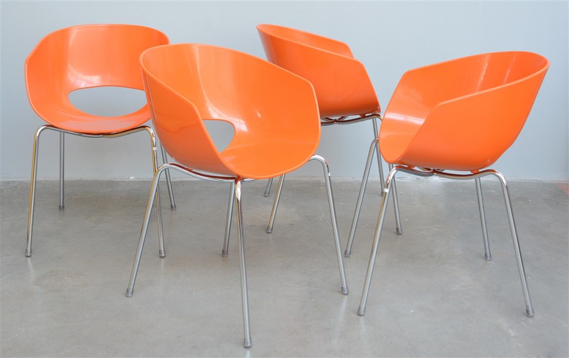 Lotto composto da quattro poltroncine arancioni modello "Orbit". Produzione Sintesi, Italia, 2002. Tecnopolimero standard, tubo d'acciaio. (cm 57x81x48)