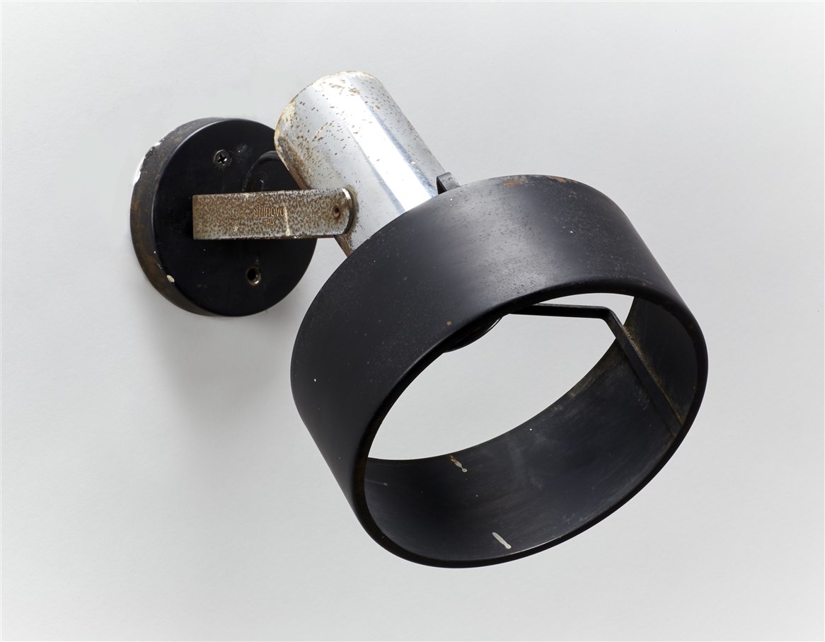 Adjustable spotlight. Milan, 1970s. Chromed and black painted steel. Bearing production mark. (h 28.5 cm.; d 16 cm.) (defects)