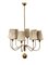 Lampada a sospensione a otto braccia in tubolare di ottone. Paralumi in stoffa,