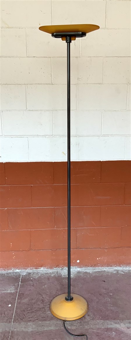 Lampada da terra modello "Jill". Produzione Arteluce, Milano, anni 70. Metallo verniciato nero e vetro acidato giallo (h cm 195) (lievi difetti). (lievi difetti)