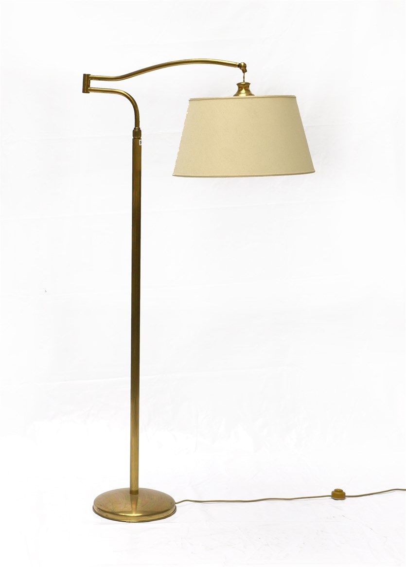 Lampada da terra con braccio snodabile, struttura in ottone lucidato e paralume in tessuto color créme. Italia, anni '40. (h cm 151) (lievi difetti)