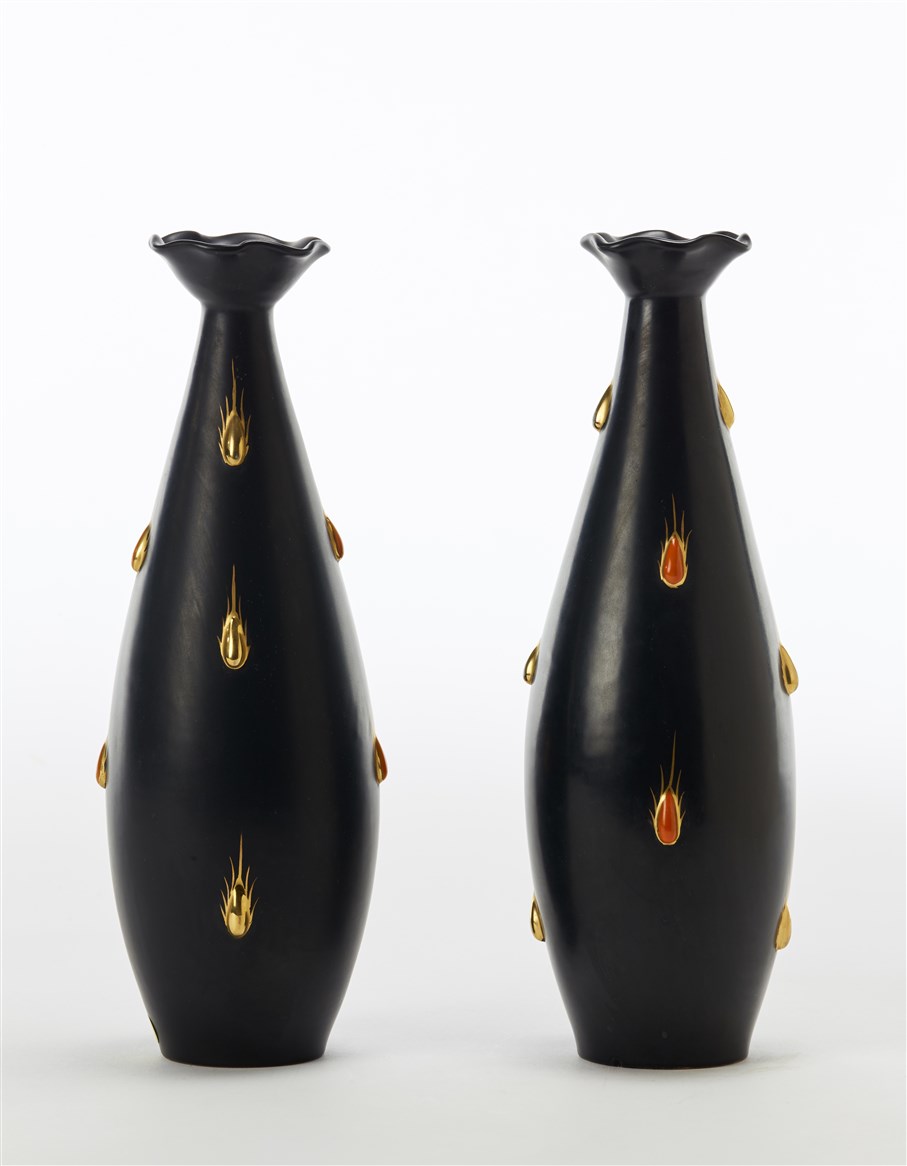 Coppia di vasi in ceramica nera con applicazioni di gocce arancioni e decorazioni dorate. Anni '50. Firmati sotto la base "Rometti Italy" un vaso recante numerale "0.139". (h cm 27) (lievi difetti)