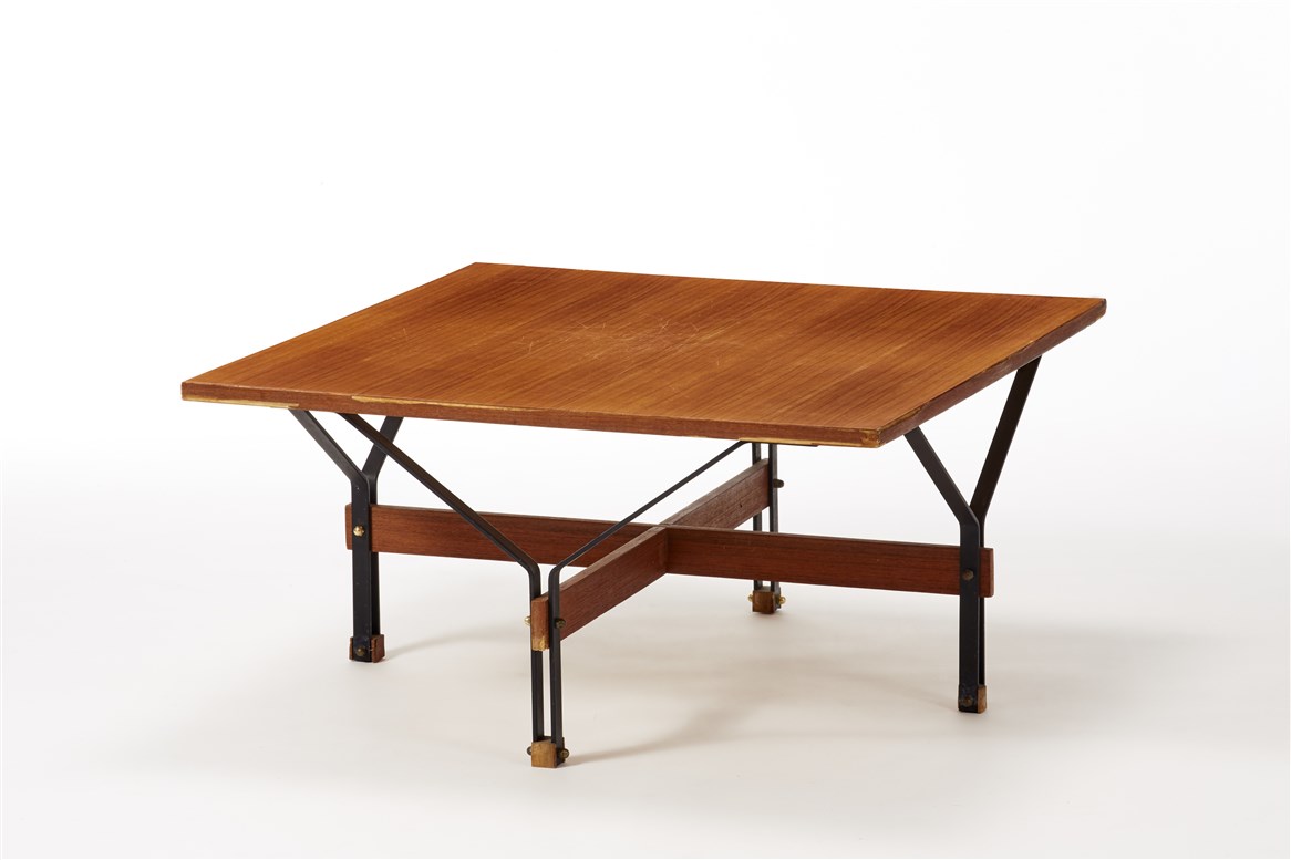 Tavolino con piano in teak impiallacciato, struttura in piattina di metallo verniciato nero e teak massello, piedini in teak massello. Italia, anni '60. (cm 75x38x75) (difetti)