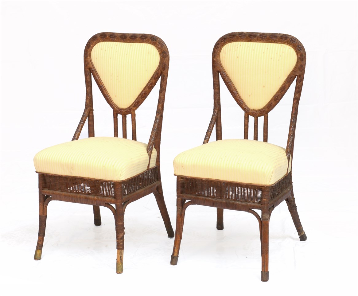 Coppia di sedie in vimini con seduta e schienale in stoffa a righe. Prima metà secolo XX. (cm 46x95x54) (difetti)