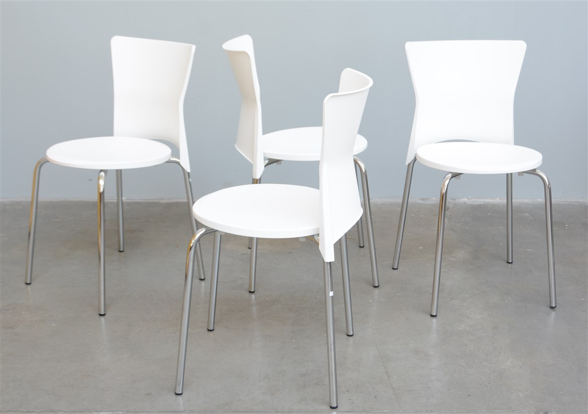 Lotto composto da quattro sedie modello "Isis". Produzione Sintesi, Italia, produzione recente. Acciaio e polipropilene bianche. (cm 41x78x46)