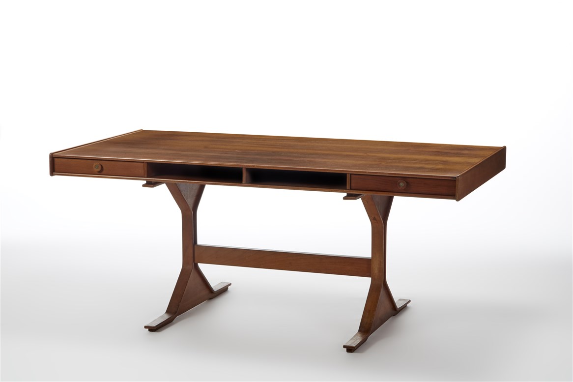 Scrivania da centro modello "530". Produzione Bernini, Milano, 1961. Fascia sottopiano a quattro cassetti su un lato e a due cassetti e due scomparti sull'altro. Legno di teak massello multistrato e impiallacciato. (cm 170x72x83) (difetti)