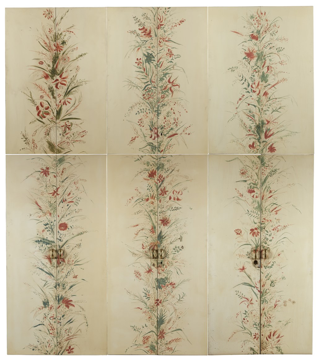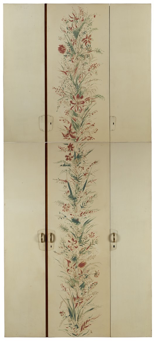 Diciassette ante di armadio laccate beige e dipinte a tempera in policromia con soggetto floreale ascrivibile allo stile di Adriano Spilinbergo, maniglie in ottone. Varedo, anni '40. (difetti)