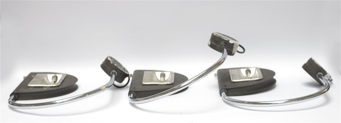 Tre lampade da parete modello "Mezzaluna". Produzione Skipper, Italia, anni '70. Metallo cormato e verniciato nero. (l cm 60) (difetti)