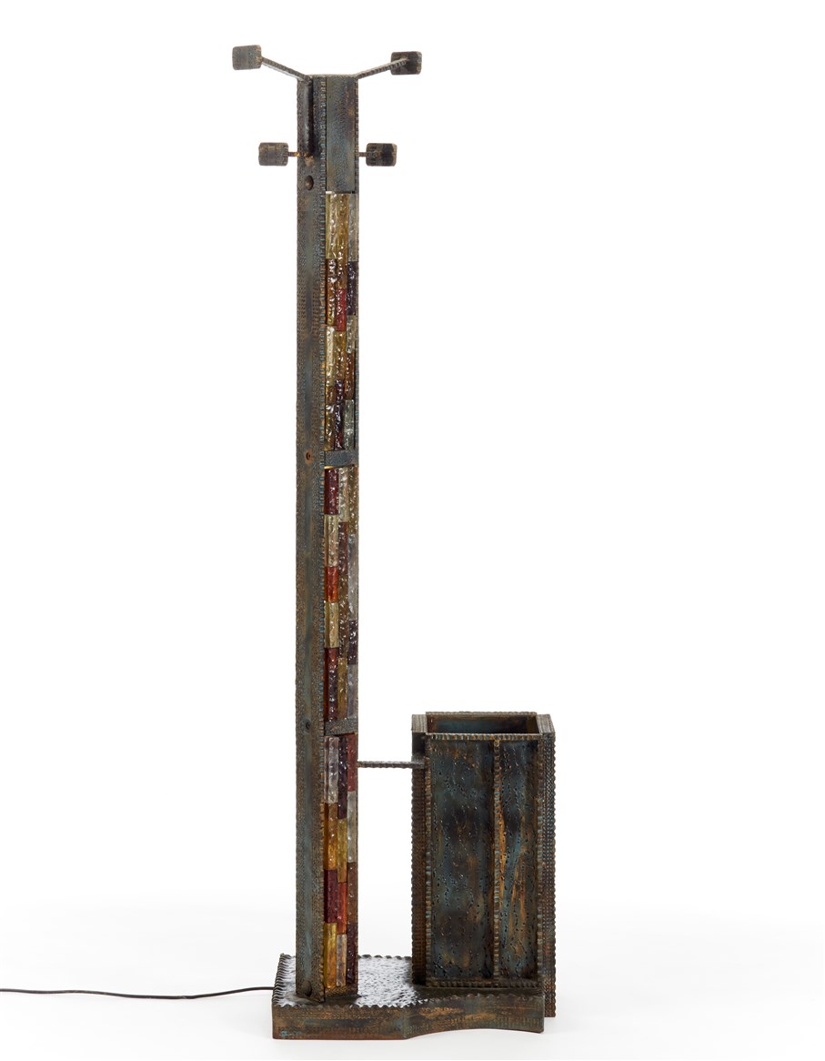 Lampada/appendiabiti/portaombrelli con struttura in ferro martellato e patinato bronzo e lastre diffusore in vetri policromi scalpellati. Italia, anni '70. (cm 50x171x38) (lievi difetti e piccole mancanze)