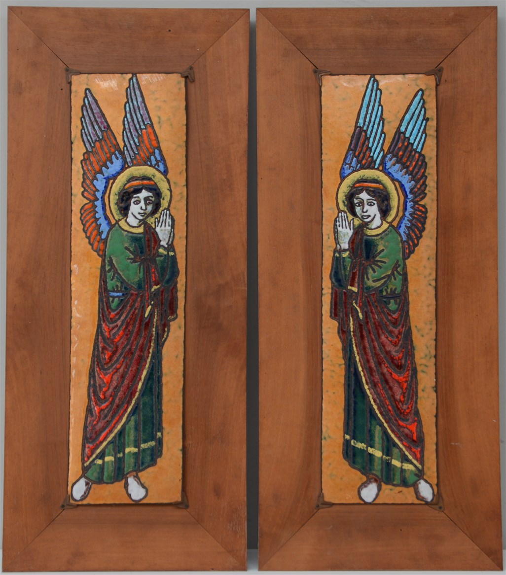 "Angeli" Lotto di due placche in rame smaltato in policromia e decorato a rilie