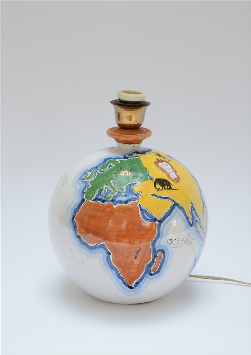 Vaso montato a lampada di forma globulare in ceramica smaltato in policromia sottovetrina con decoro raffigurante il globo terrestremontato a lampada raffugurante il globo terrestre. Italia, metà secolo XX. Marcato sotto la base "D 121/3 e con monogramma della manifattura. (h cm 30) (lievi difetti)