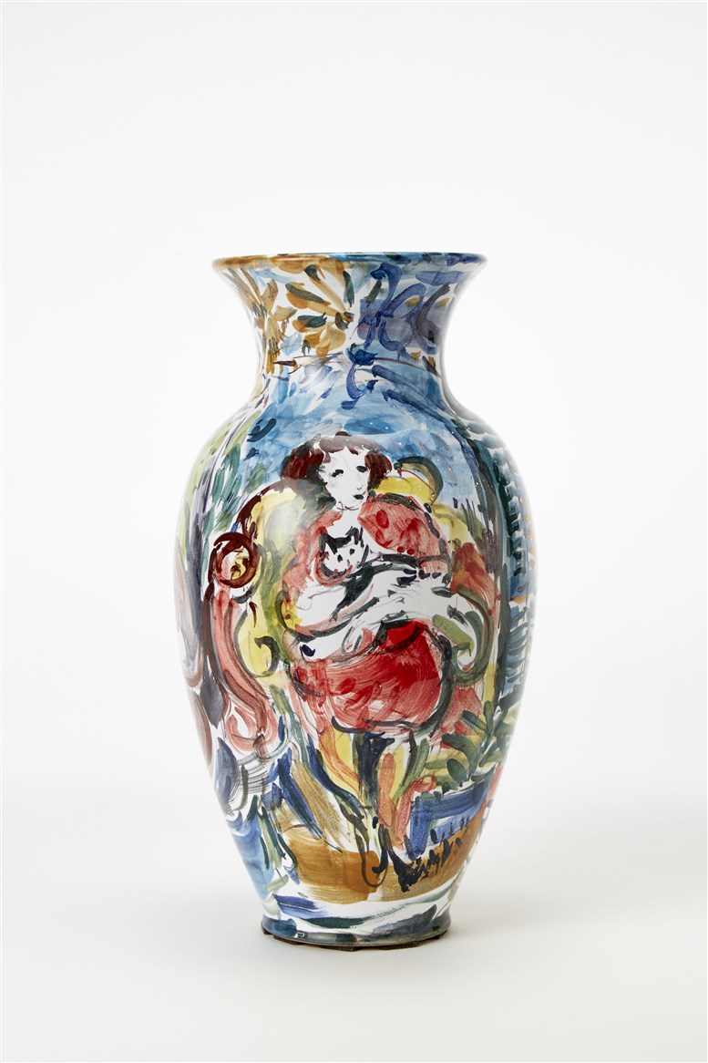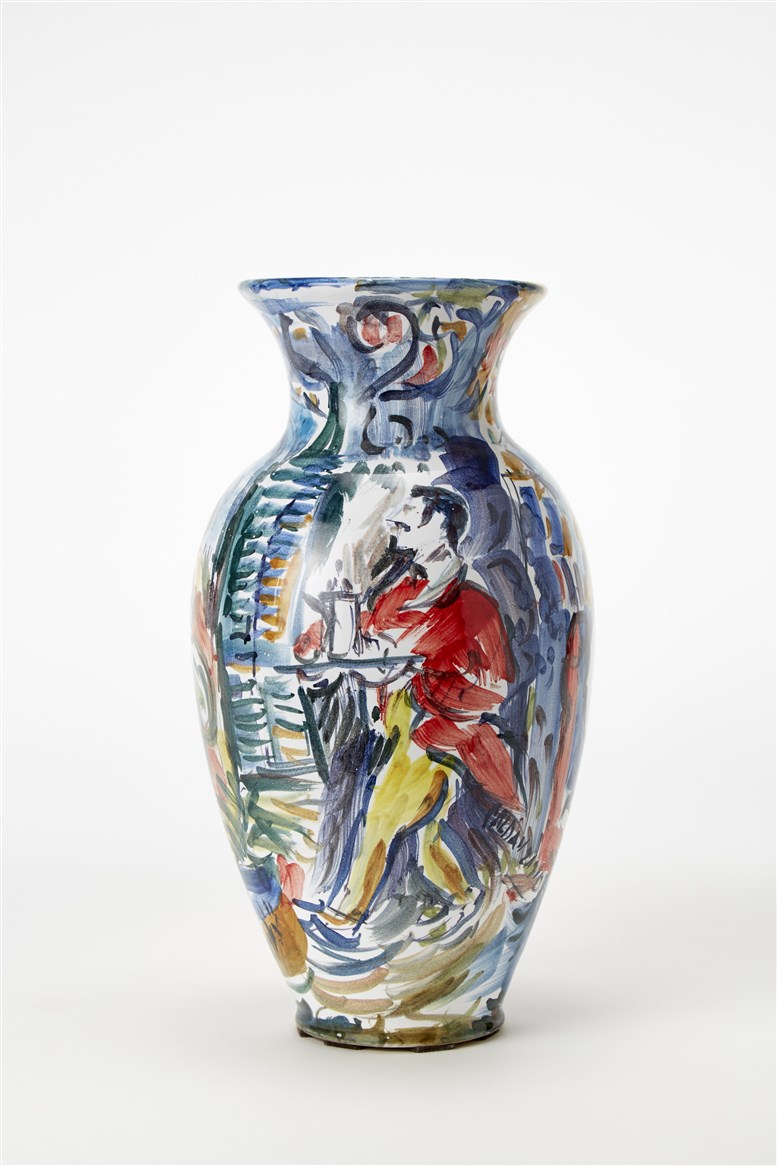 Ceramic vase in polychromy underglazed with anthropomorphic subjects. Manufacture of Ceramiche S. Giorgio, Albisola, 2006. Signed in the center under the base. (h 42 cm.)