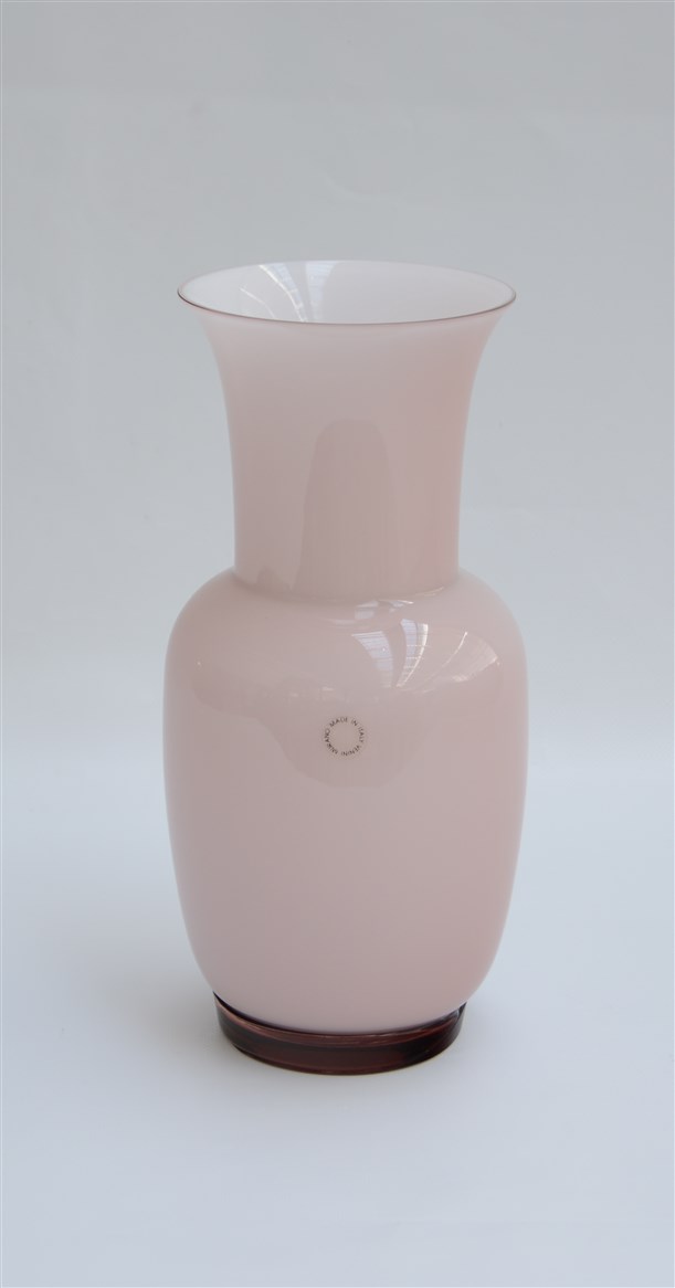 Vaso a balaustro della serie "Opalini". Murano, 1991. Vetro incamiciato rosa lattimo. Disegno n° 706.38 del catalogo verde. Firmato a punta sotto la base "Venini 91". (h cm 28,9)