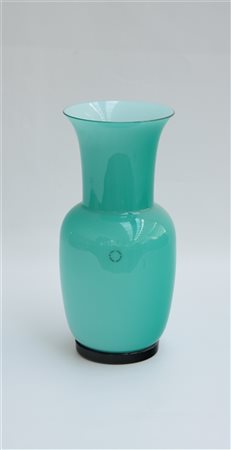Vaso a balaustro della serie "Opalini". Murano, 1993. Vetro incamiciato verdemare lattimo. Disegno n° 706.38 del catalogo verde. Firmato a punta sotto la base "Venini 93 Gruppo Ferruzzi". (h cm 28,9)