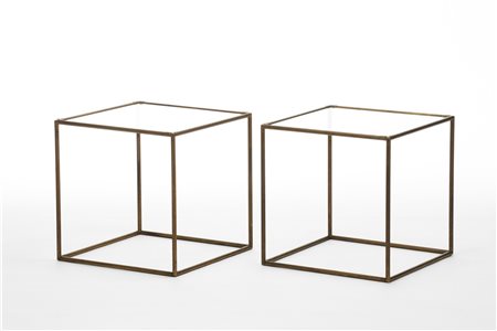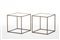 Coppia di tavolini cubici con struttura in metallo dorato e ripiani in vetro. (