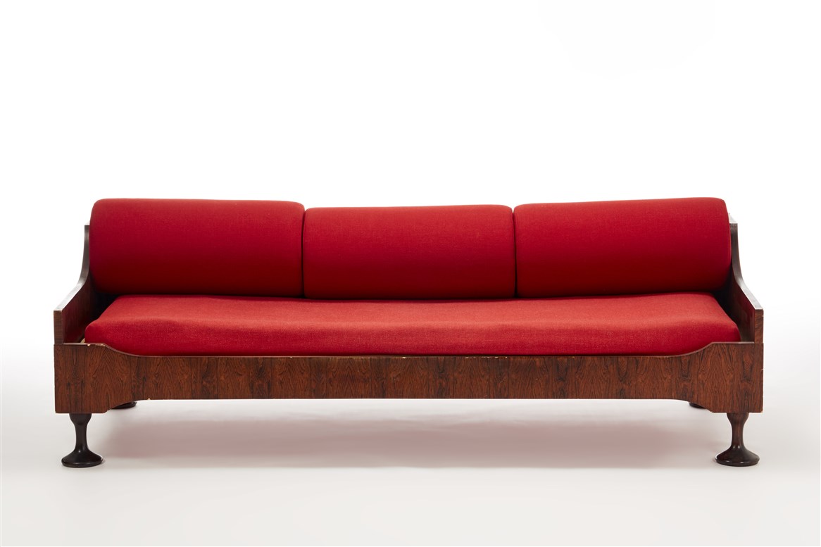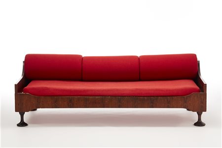 Divano con struttura in legno di palissandro indiano massello, impiallacciato e bordato, cuscini e schienale imbottiti rivestiti in in tessuto rosso, gambe bulbiformi in legno massello tornito. Mobilia, Milano, anni '60. (cm 200x60x87) (difetti)
