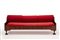Sofa with structure in solid, veneered and bordered Indian rosewood, cushions and backrest padded covered in red fabric, bulbous legs in solid wood. Mobilia, Milan, 1960s. (200x60x87 cm.) (defects)