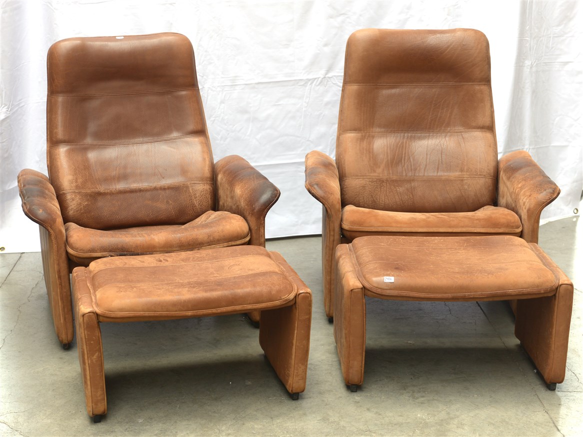 De Sede Coppia di poltrone con schienale reclinabile e con pouf. Svizzera, anni