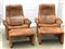 Coppia di poltrone con schienale reclinabile e con pouf. Svizzera, anni '60. Pelle marrone. (poltrone: cm 85x95x85; pouf: cm 66x36x45) (difetti)