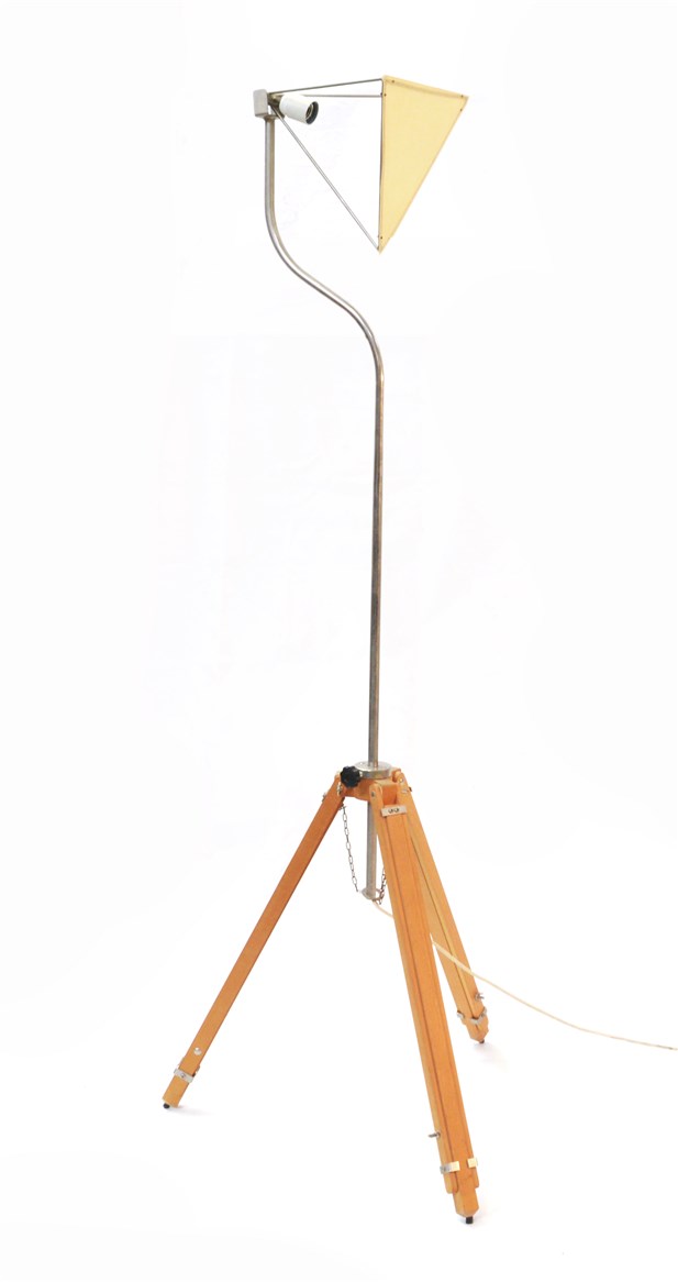 Lampada da terra tripode regolabile in altezza in legno massello e acciaio, paralume in pergamoide. Italia, anni '90. (h cm 164) (difetti)