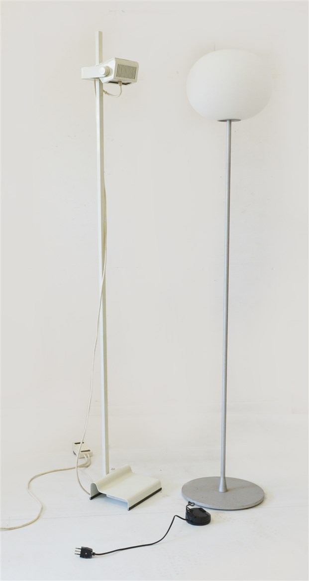 Lotto composto da due lampade da terra, delle quali una in metallo laccato con paralume a faretto orientabile e regolabile in altezza, l'altra con fusto e base in metallo verniciato e satinato e paralume sferico in vetro incamiciato lattimo satinato. Italia, produzione recente. (h cm 180 e h cm 170) (lievi difetti)