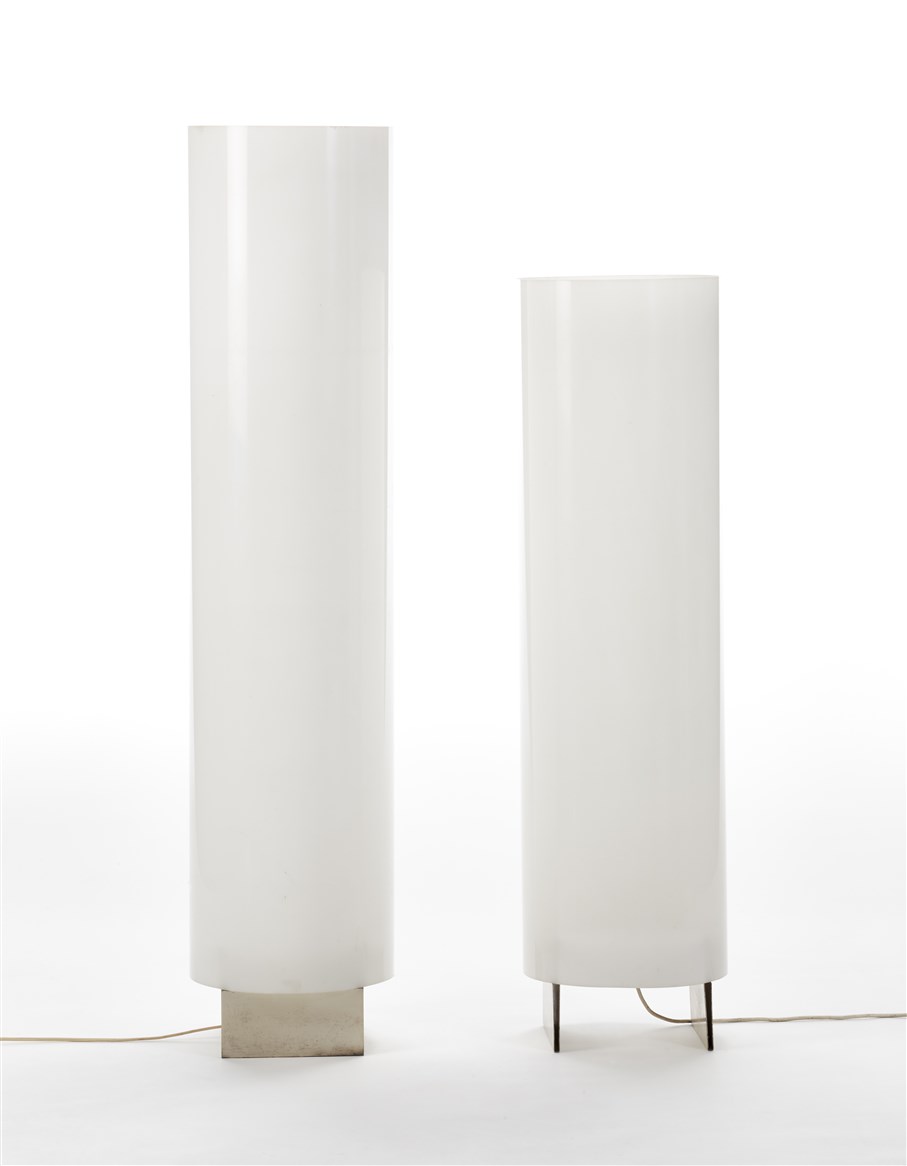 Lotto di due lampade da terra cilindriche in plexiglass opalino con base in lamina di metallo piegata, spazzolata a mano, argentata e verniciata con trasparente. Bregnano, 1975. Modelli sperimentali prodotti dall'autore in serie limitata. Firma "SABATTINI" incussa alla base. (d cm 30 e h cm 134; d cm 30 e h cm 112) (lievi difetti)