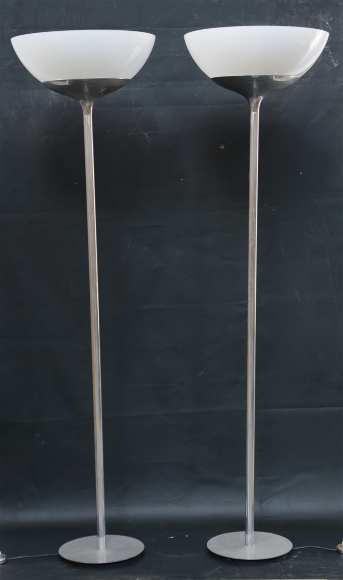 Coppia di lampade da terra modello "Aminta". Produzione Artemide, Milano, 1966. Struttura in ottone cromato, diffusore in vetro incamiciato lattimo. (h cm 178) (difetti)