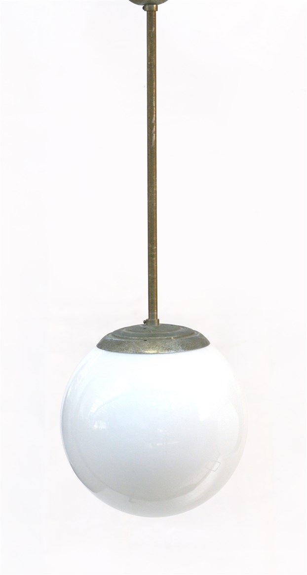 Lampada a sospensione con paralume in vetro soffiato lattimo. (h cm 55) (difetti)
