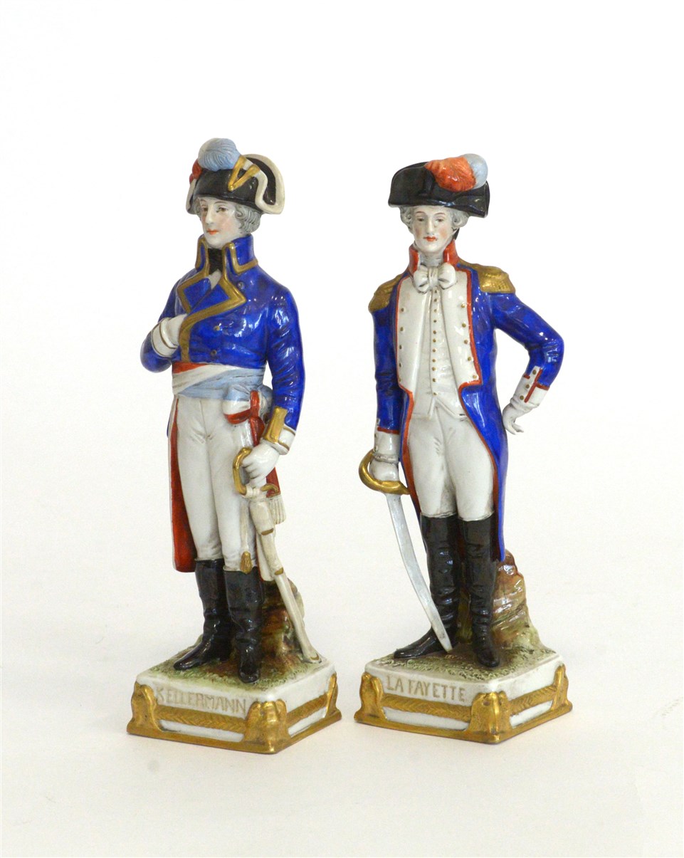 Lotto di due figurini in porcellana policroma raffiguranti Lafayette e Kellerma
