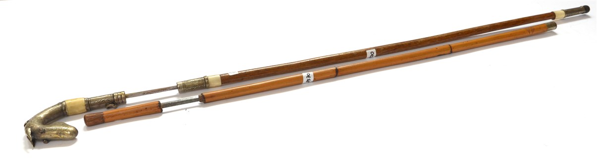 Coppia di bastoni animati. Uno in bambù con all'interno parte di una lama a losanga, l'altro con parti in avorio ed impugnatura in metallo argentato a forma di cavallo con incisioni, canna in malacca ed all'interno lama a quadrello. Origini orientali