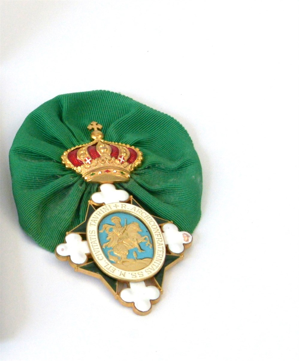 Insegna mauriziana in metallo dorato e smalti su base della croce di San Lazzaro e San Maurizio raffigurante San Maurizio a cavallo,