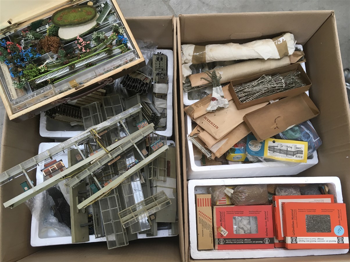 Lotto di due cartoni contenenti numerosi elementi per modellismo ferroviario: b