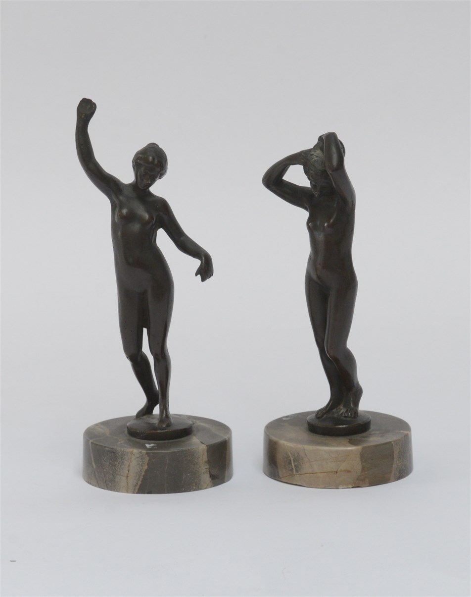 Coppia di sculturine in bronzo raffiguranti nudi femminili su basi tonde in marmo (h cm 18) (difetti)
