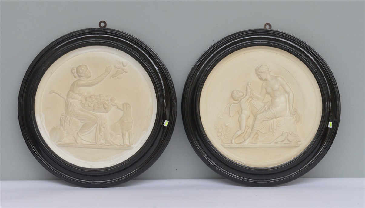 Coppia di altorilievi tondi in gesso raffiguranti scene classiche (d. cm 34) in