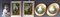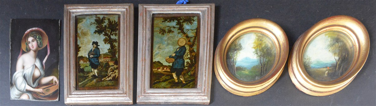 Lotto composto da una coppia di piccoli dipinti tondi raffiguranti paesaggi ed una coppia di fixè raffiguranti personaggi popolari in cornice uniti ad un piccolo dipinto su metallo raffigurante suonatrici (difetti)