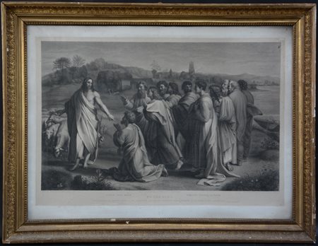 Incisione del secolo XIX raffigurante "L'investitura di Pietro da parte del Cristo" (cm 65x88) in cornice coeva (difetti)