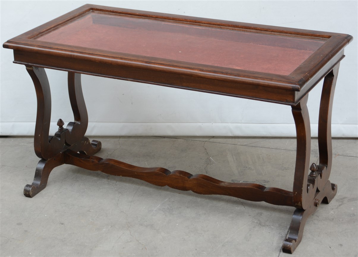 Tavolino da salotto con piano contenitore a vetrina, montanti sagomati (cm 95x53x50) (difetti)