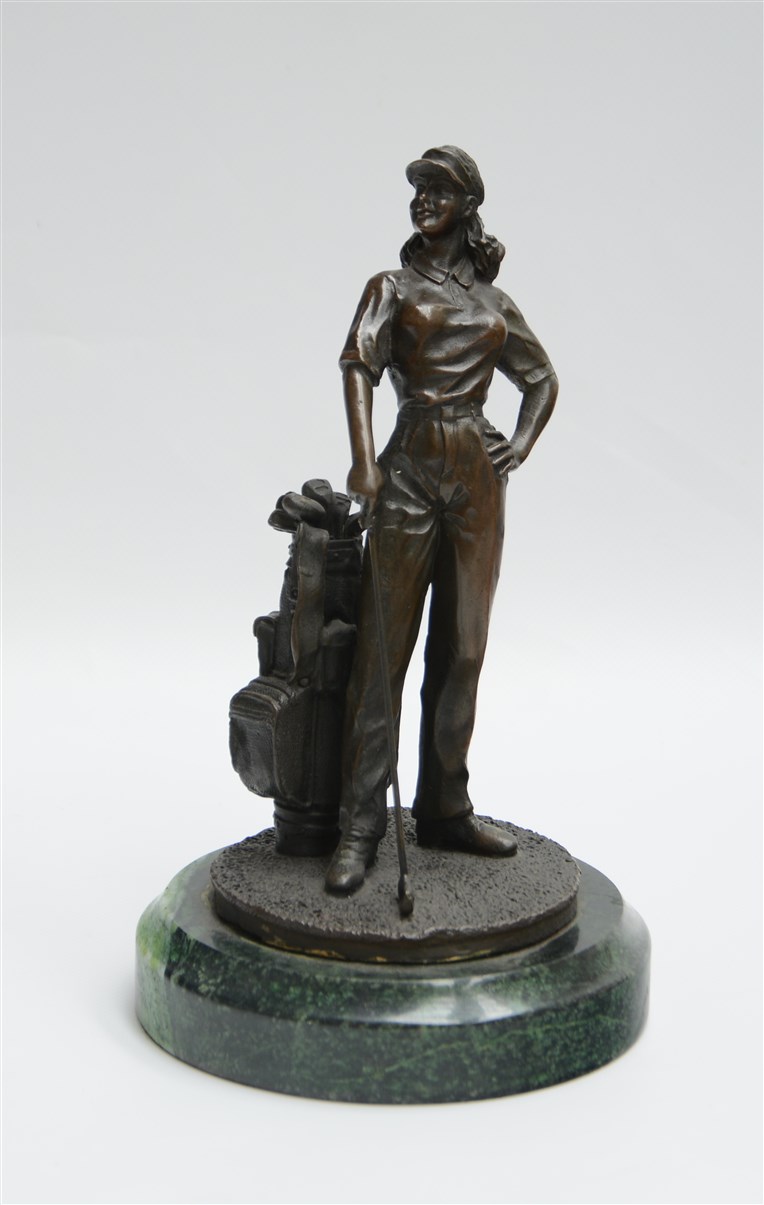 Ignoto, "Giocatrice di golf", scultura in bronzo su base in marmo verde (H tot