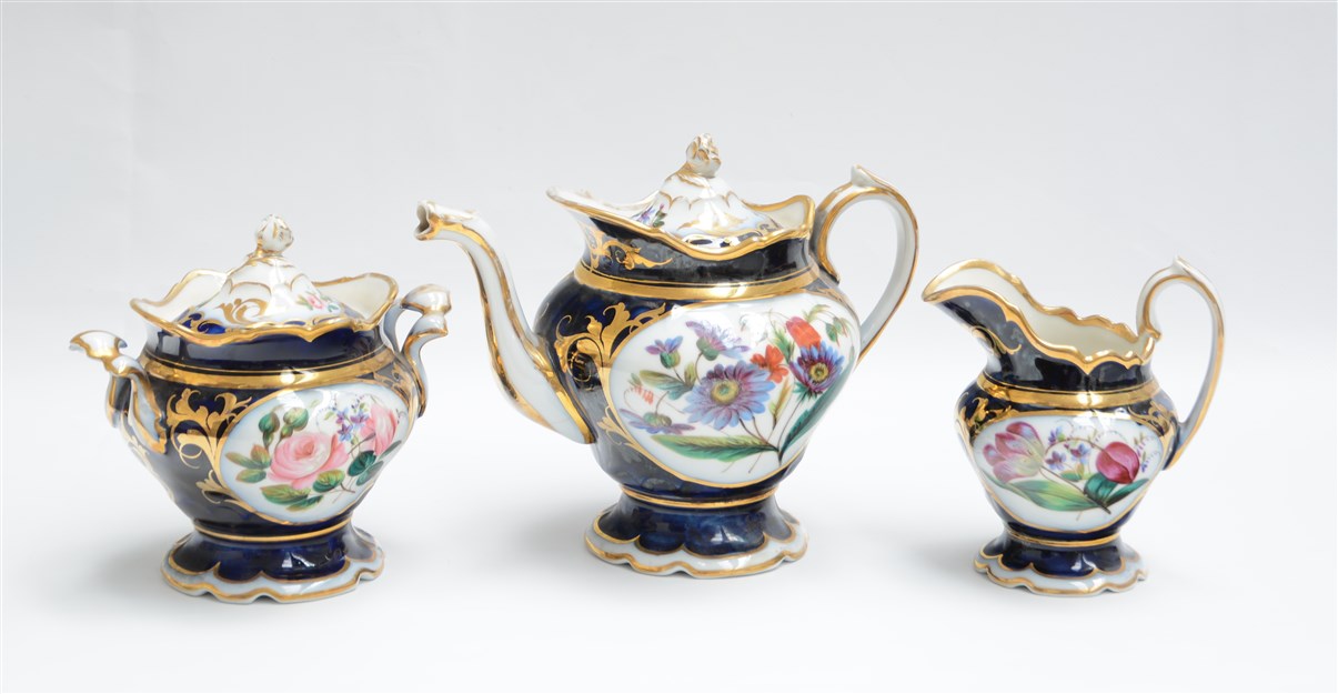 Manifattura francese, lotto composto da teiera, lattiera e zuccheriera in porcellana dipinta a motivi floreali e filettatura in oro (lievi difetti)