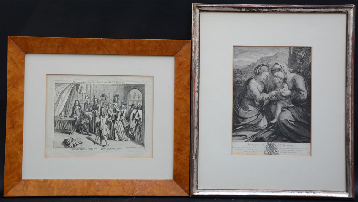 Lotto di due incisioni raffiguranti una scena d'interno e la Madonna con Bambino e santa Caterina, in cornici (difetti)
