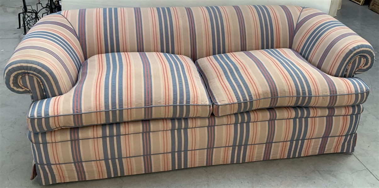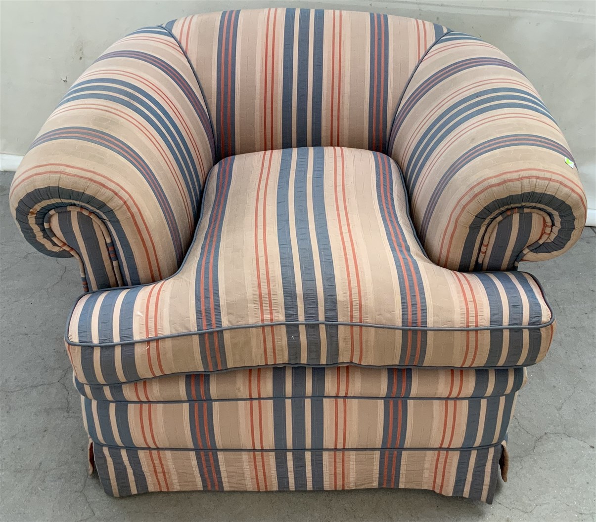 Parte di fornitura da salotto composta da un divano a due posti e una poltrona rivestiti in tessuto a righe (difetti)
