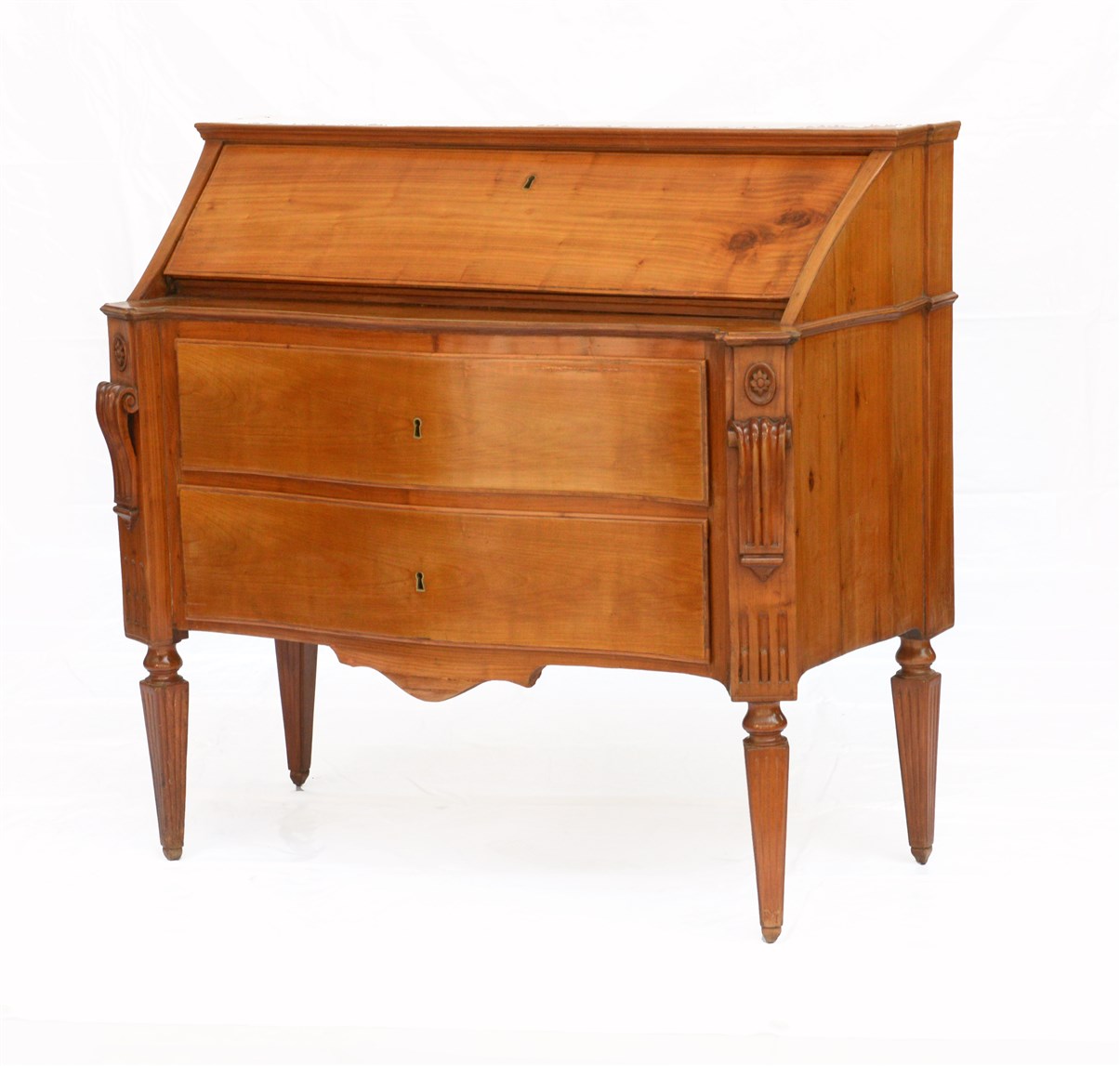 Ribalta con fianchi e fronte mossi, due cassetti, anta celante cinque cassettini e vano, montanti intagliati e gambe rastremate e scanalate. Inizio secolo XIX (cm 115x111x57) (difetti e restauri)