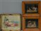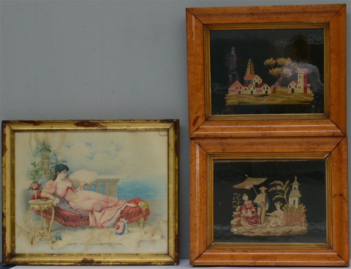 Lotto composto due ricami piccolo punto in lana, Francia ? secolo XX, raffiguranti paesaggi su fondo nero in cornice in radica di legno ed una litografia a colori raffigurante gentildonna, in cornice (difetti e mancanze)