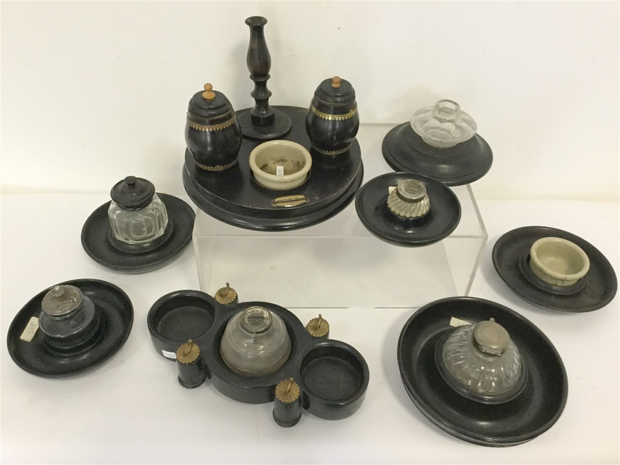 Gruppo di otto calamai in legno ebanizzato di forma circolare con contenitori in vetro e ceramica, fatture differenti (difetti e mancanze)