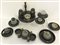 Gruppo di otto calamai in legno ebanizzato di forma circolare con contenitori i
