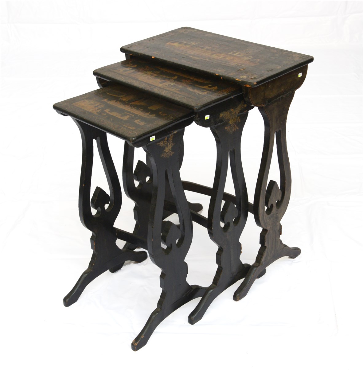 Gruppo di tre tavolini a nido in legno laccato nero e dipinto in policromia e oro a figure e paesaggi orientali, secolo XIX (chiuso cm 50x70x30) (difetti e mancanze)