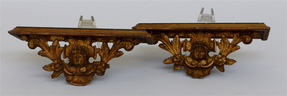 Coppia di mensoline in legno laccato con fregi dorati a testa di cherubini alat
